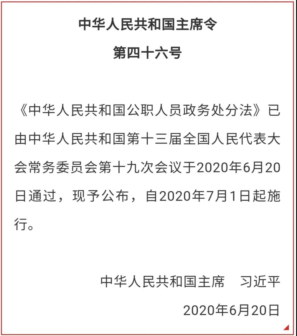 第46号主席令签署公布:通过《公职人员政务处分法》,7月1日起正式实施!