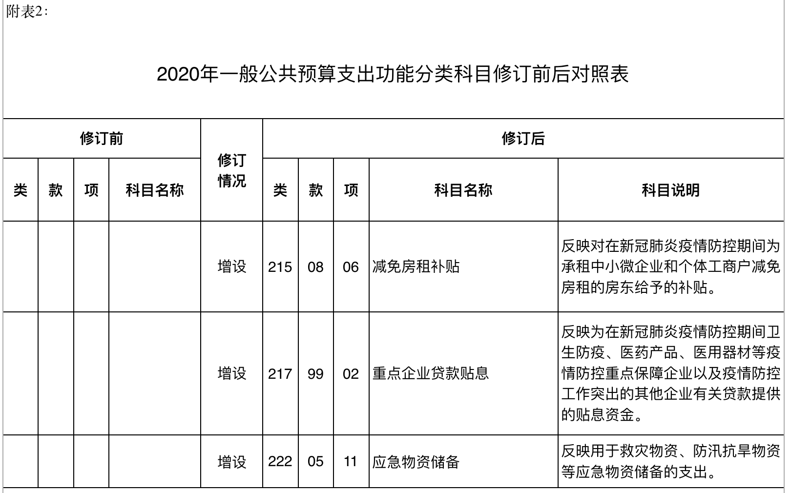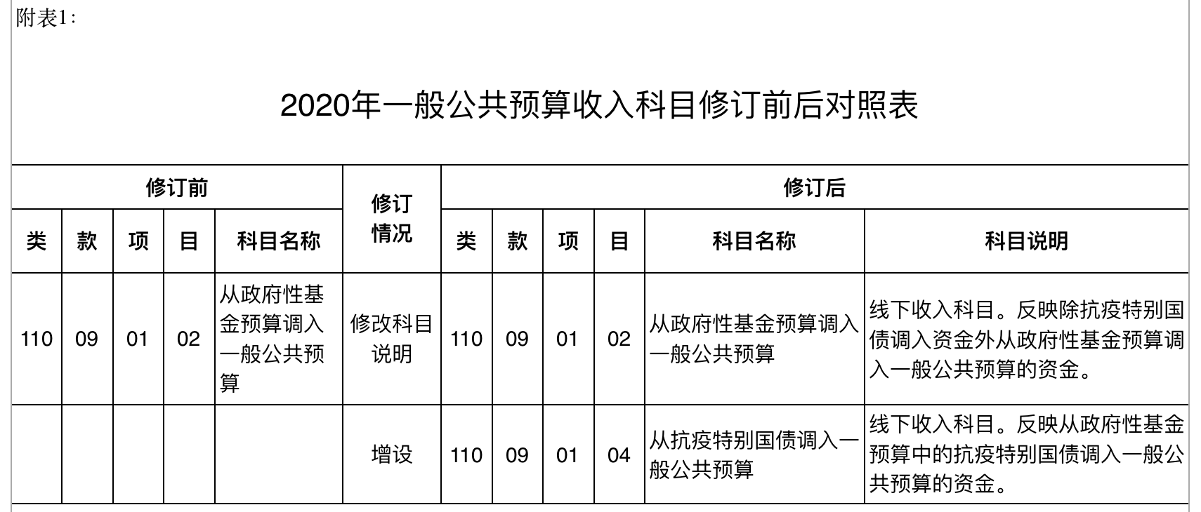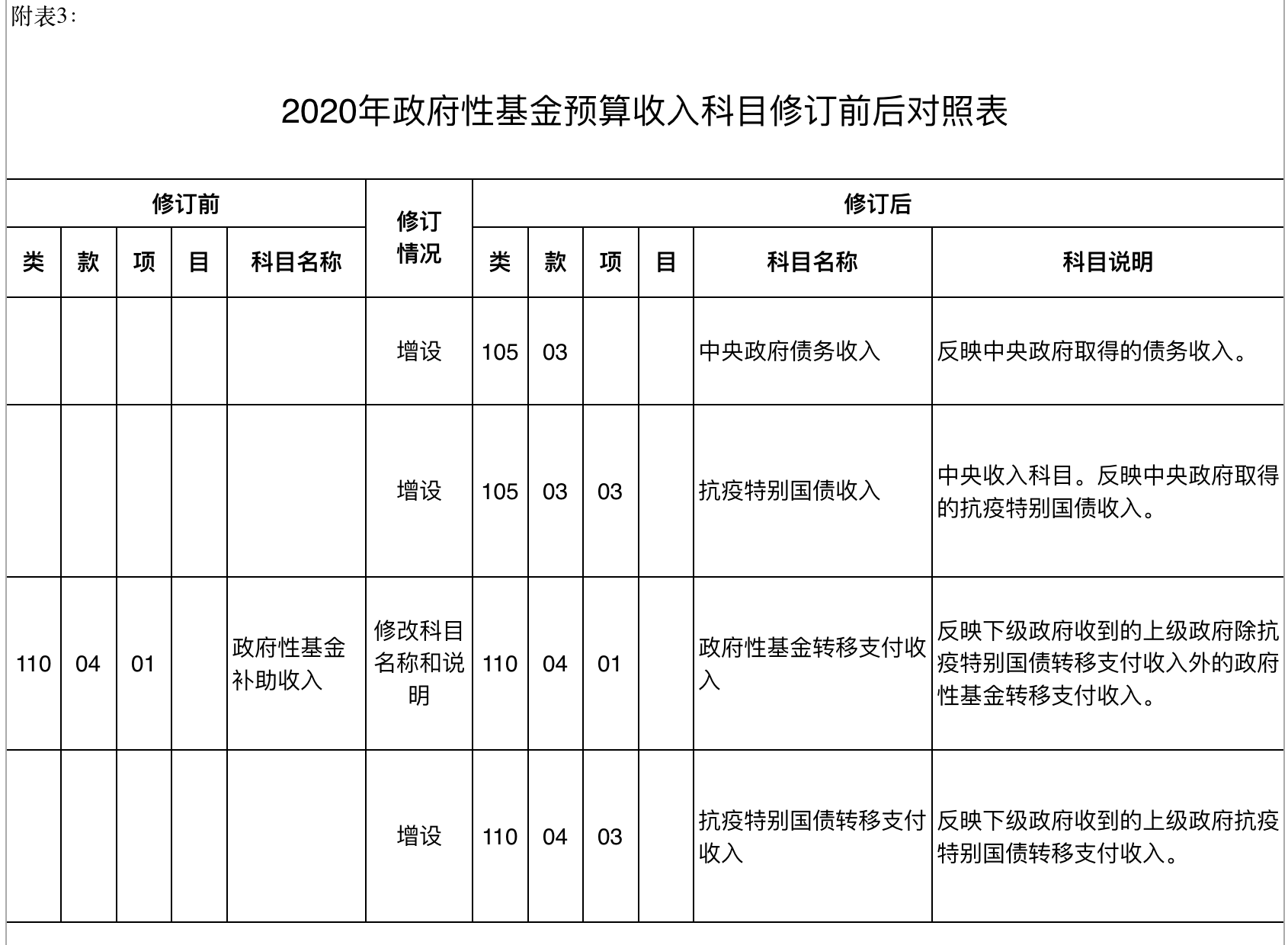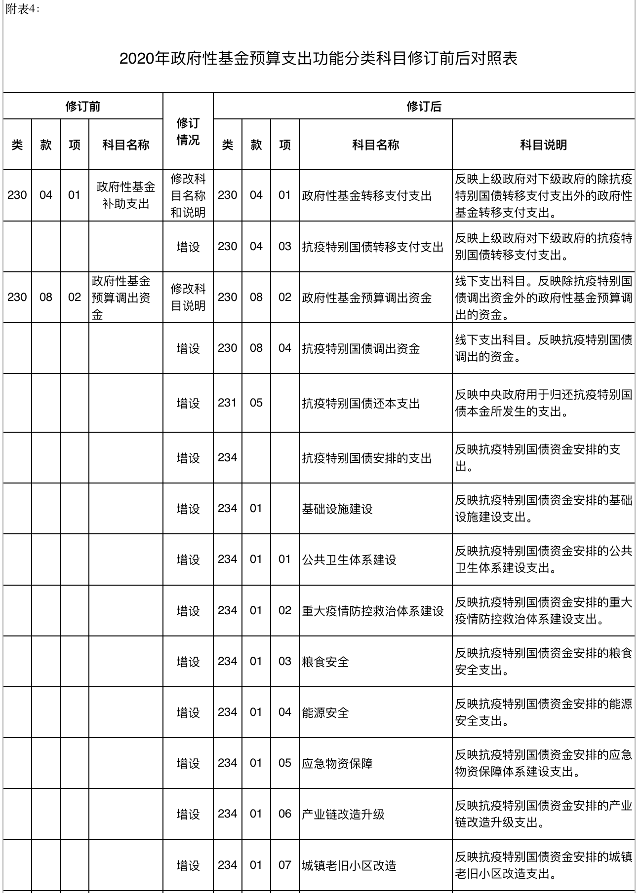 根据抗疫特别国债资金管理有关文件的规定,现修订《2020年政府收支分类科目》,具体修订情况见附件。 财 政 部