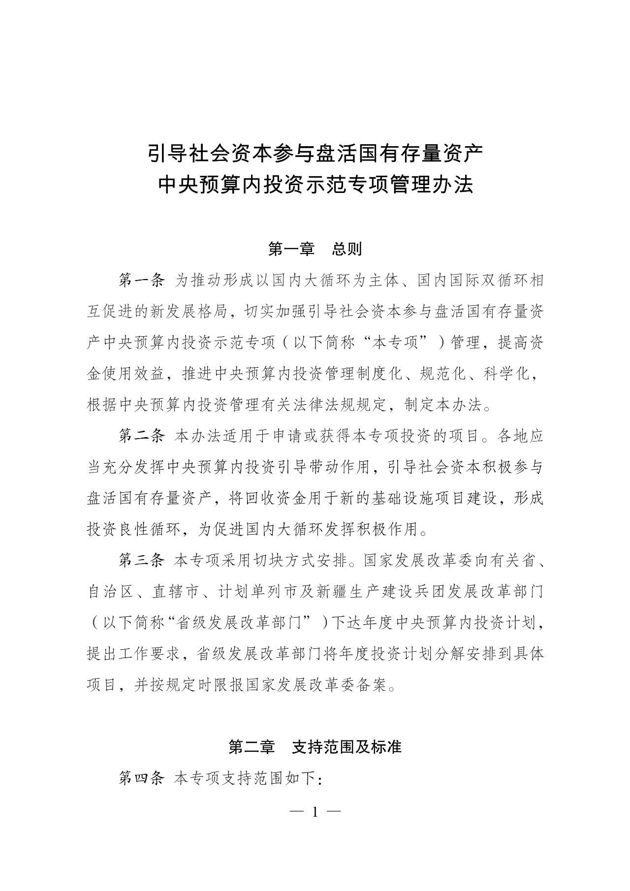 为有效引导社会资本参与盘活国有存量资产、形成投资良性循环,推动形成以国内大循环为主体、国内国际双循环相互促进的新发展格局,提高中央预算内投资使用效益,根据《政府投资条例》等有关规定,国家发展改革委研究制定了《引导社会资本参与盘活国有存量资产中央预算内投资示范专项管理办法》。现印发给你们,请按照执行。