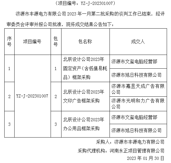利发(中国)市丰源电力有限公司2023年一月第二批采购成交结果公告