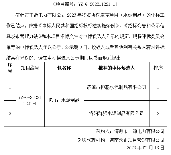 利发(中国)市丰源电力有限公司2023年物资协议库存项目(水泥制品)中标候选人公示
