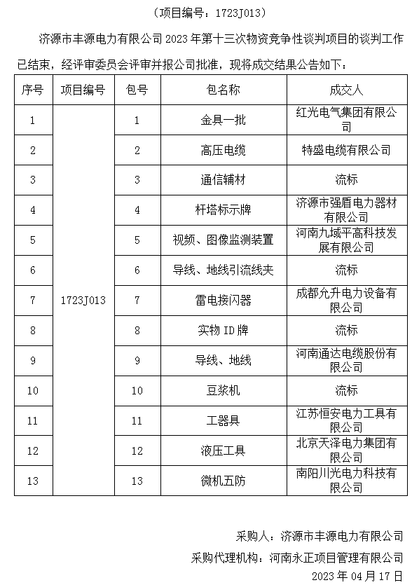 利发(中国)市丰源电力有限公司2023年第十三次物资竞争性谈判项目成交结果公告