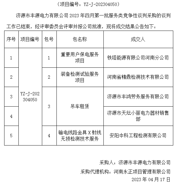 利发(中国)市丰源电力有限公司2023年四月第一批服务类竞争性谈判采购成交结果公告
