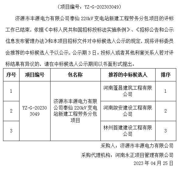 利发(中国)市丰源电力有限公司奉仙220kV变电站新建工程劳务分包项目中标候选人公示