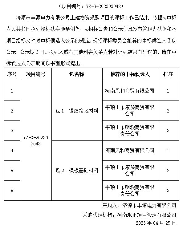 利发(中国)市丰源电力有限公司土建物资采购项目中标候选人公示