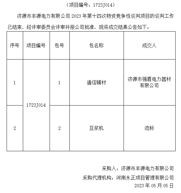 利发(中国)市丰源电力有限公司2023年第十四次物资竞争性谈判项目成交结果公告