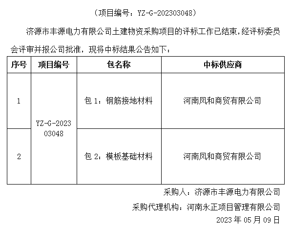 利发(中国)市丰源电力有限公司土建物资采购项目中标结果公告