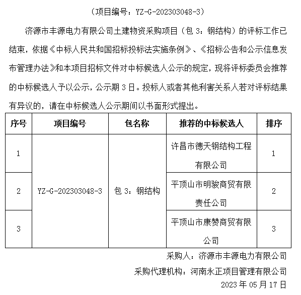 利发(中国)市丰源电力有限公司土建物资采购项目(包3:钢结构)中标候选人公示