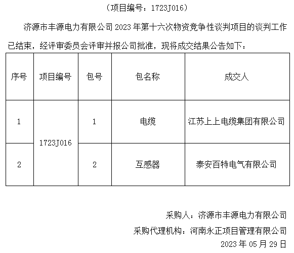 利发(中国)市丰源电力有限公司2023年第十六次物资竞争性谈判项目成交结果公告