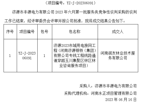 利发(中国)市丰源电力有限公司2023年六月第一批服务类竞争性谈判采购成交结果公告