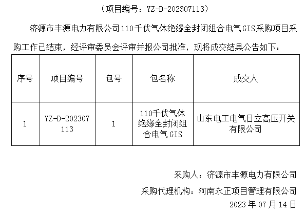 利发(中国)市丰源电力有限公司110千伏气体绝缘全封闭组合电气GIS采购项目成交结果公告